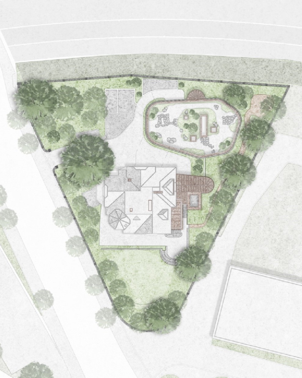 Das prägnante dreieckige Grundstück, mit seinem historischen Villengarten, wird gegen die Bahn mit einer Schallschutzmauer neu gefasst und förmlich lesbar gemacht. Gleichzeitig inszeniert der räumlich vergrösserte nördliche Garten die Villa und gibt ihre die nötige Öffnung für die Eingangssituation.
