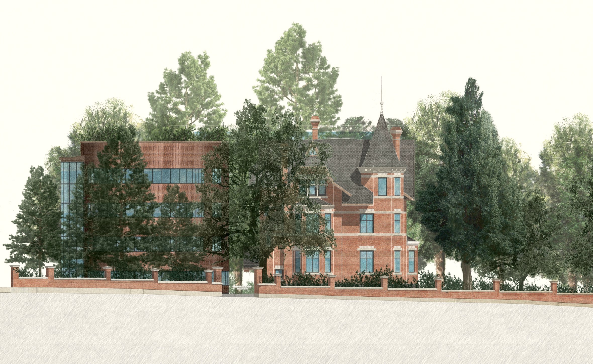 Das prägnante dreieckige Grundstück mit seinem historischen Villengarten wird zur Bahnseite mit einer Schallschutzmauer neu gefasst und lesbar gemacht- gestalterisch als repräsentative Weiterentwicklung der bestehenden historischen Einfassungsmauer konzipiert und in Klinker und Naturstein ausgeführt. Als prägnanter Abschluss der Parzelle fasst sie das Ensemble räumlich und verleiht dem Gesamtbild Geschlossenheit und Bestand.